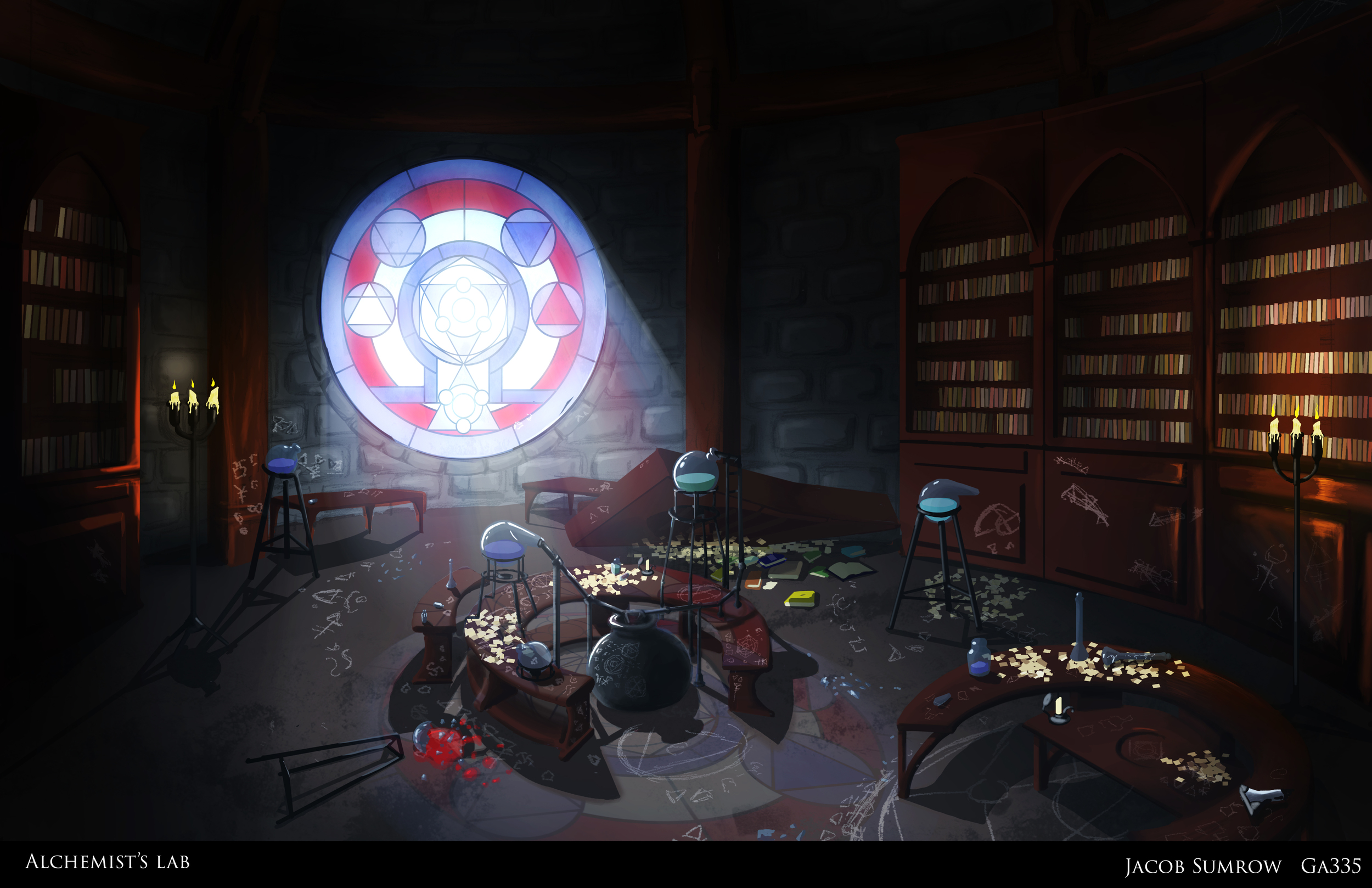 The private study of an alchemist descending to madness as they have delved deeper and deeper into their experiments. Modeled in Maya, textures created with Photoshop, rendered in UDK