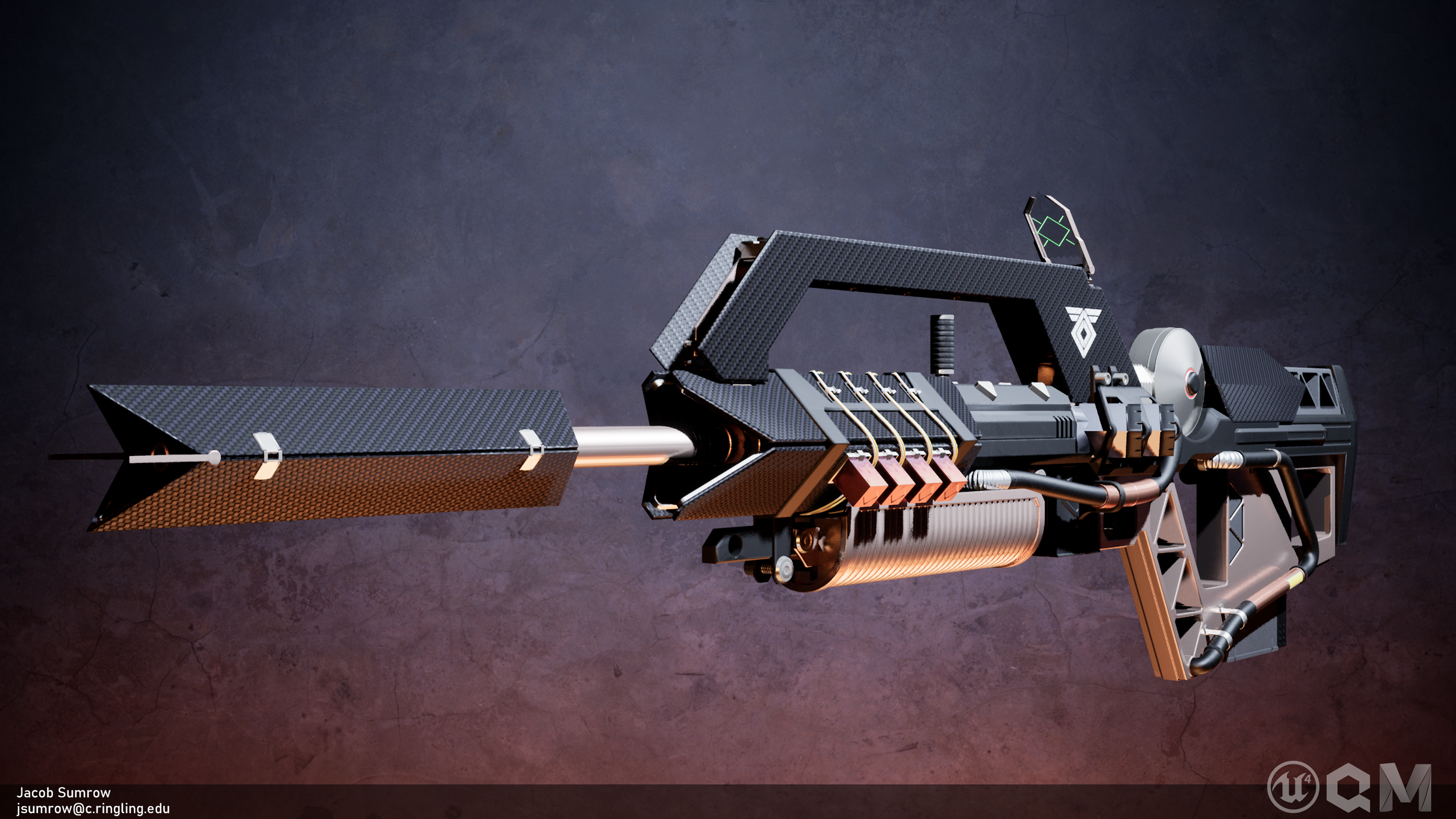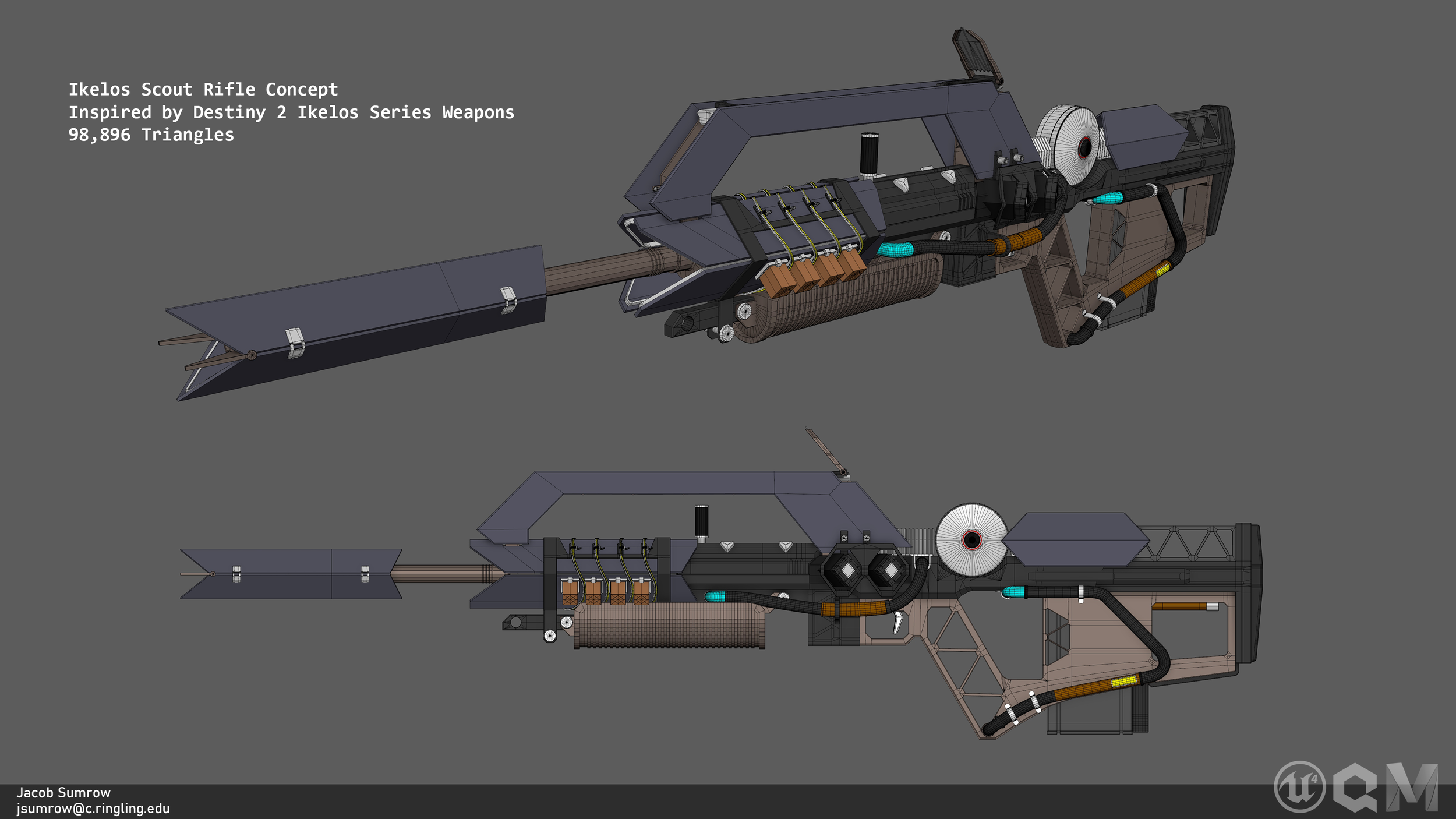 Concept for an experimental rifle inspired by the Ikelos series of weapons from Destiny 2, created by Bungie. I based the design off of a Famas-1 assault rifle and kept as many of the visual markers of this series of weapon as I could in my design.