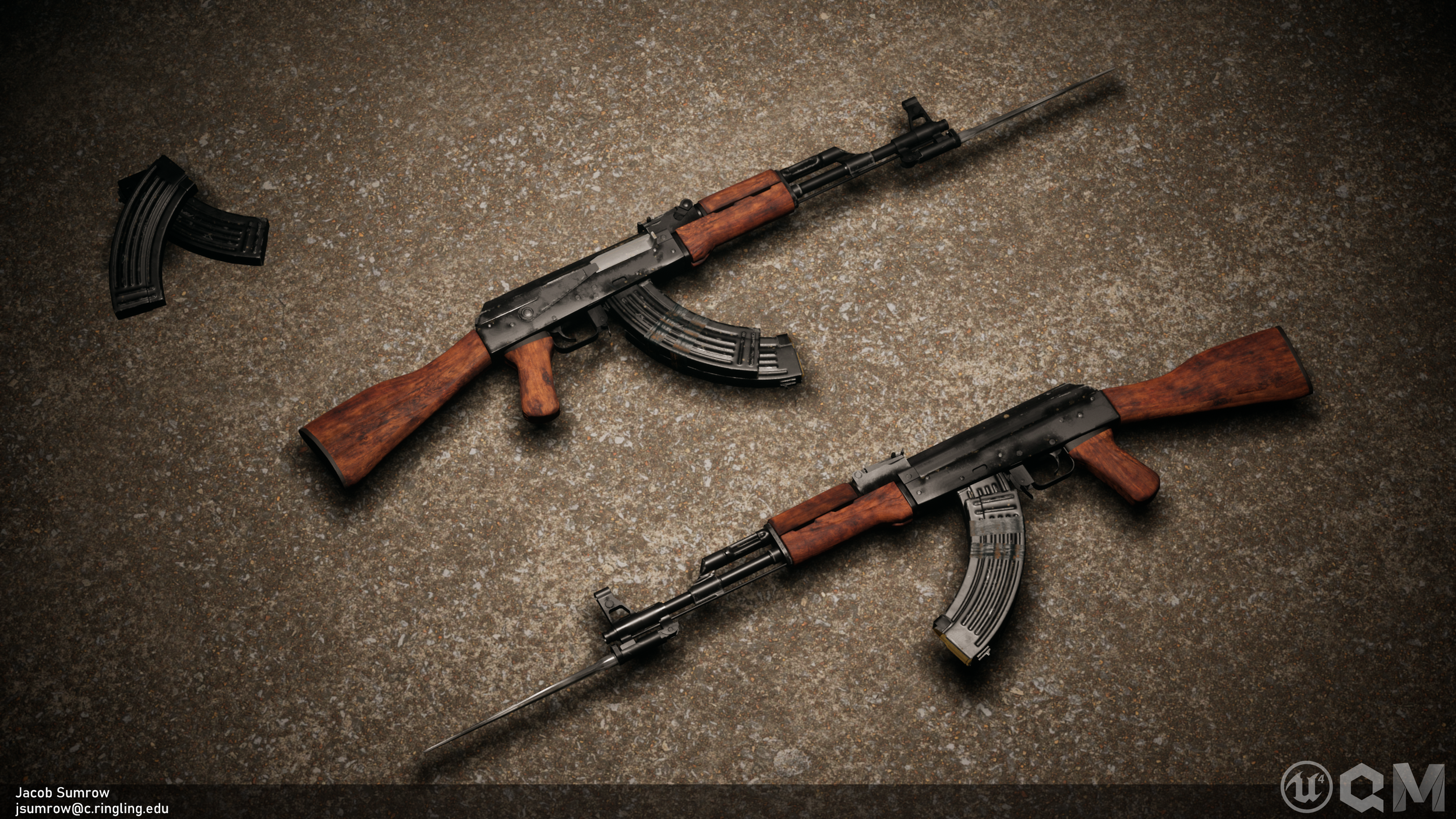 These models were created as part of development for a game that was scrapped early in its development. Assets modeled in Maya. Type-56 assault rifle textured in Photoshop using the Quixel Suite. Rendered in Unreal Engine 4